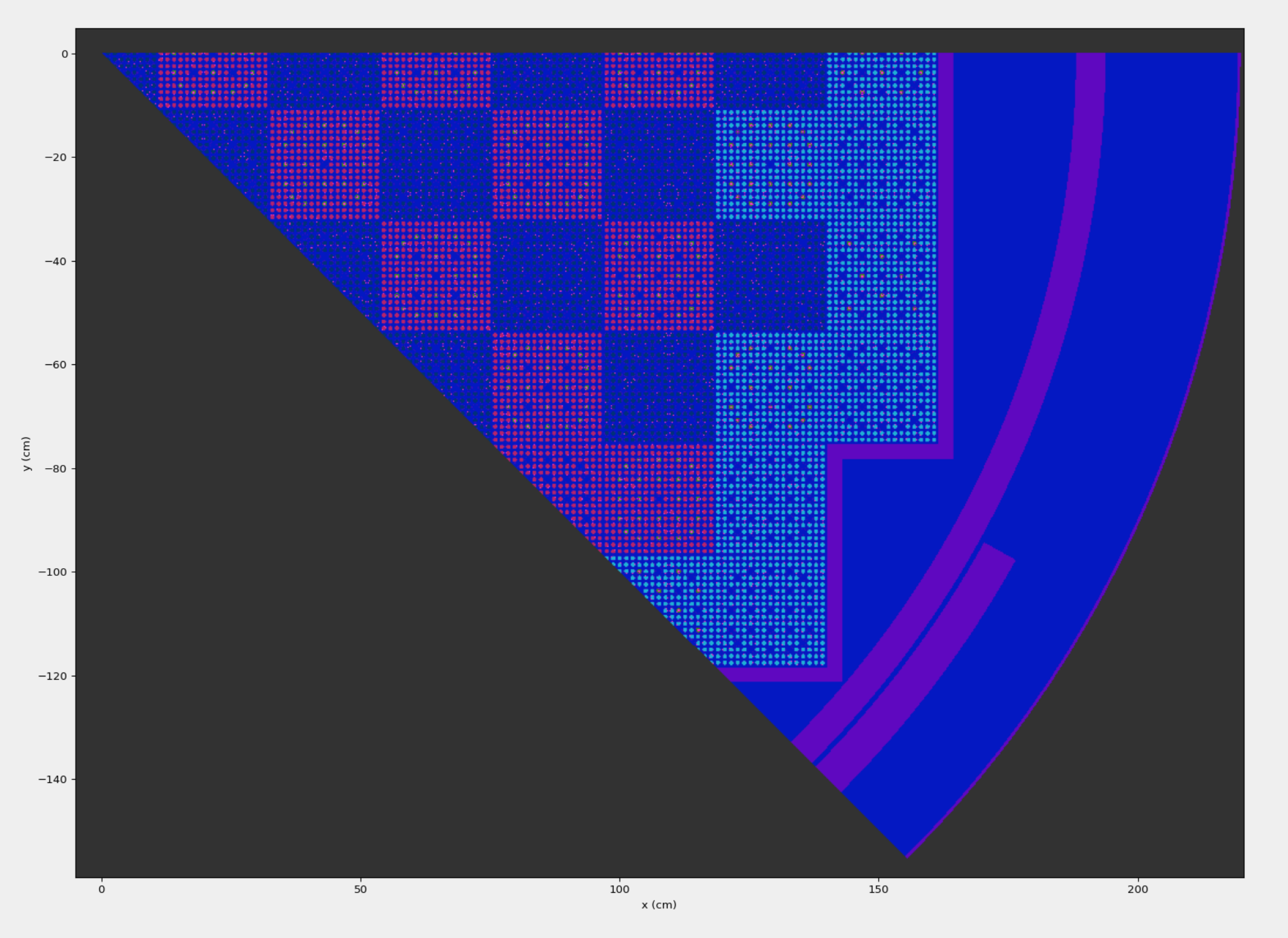 可见两者的模型是一致的,只是CRANE模型的边界为活性区向外拓展若干个组件宽度(通过 num_assembly_layers_reflector 控制,默认为一个组件),而OpenMC的模型边界为反射层结构体定义中的最外围的 primitive 对象。